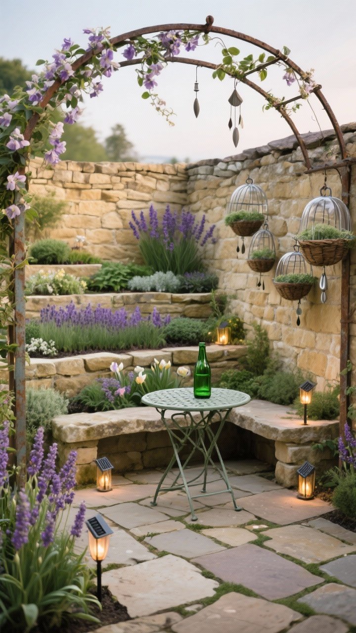Concevez un petit enclos de pierre sèche qui ressemble à un jardin secret. Une arche en fer vieilli couverte de clématites marque l’entrée, avec un sentier en dalles irrégulières menant à un banc en pierre.