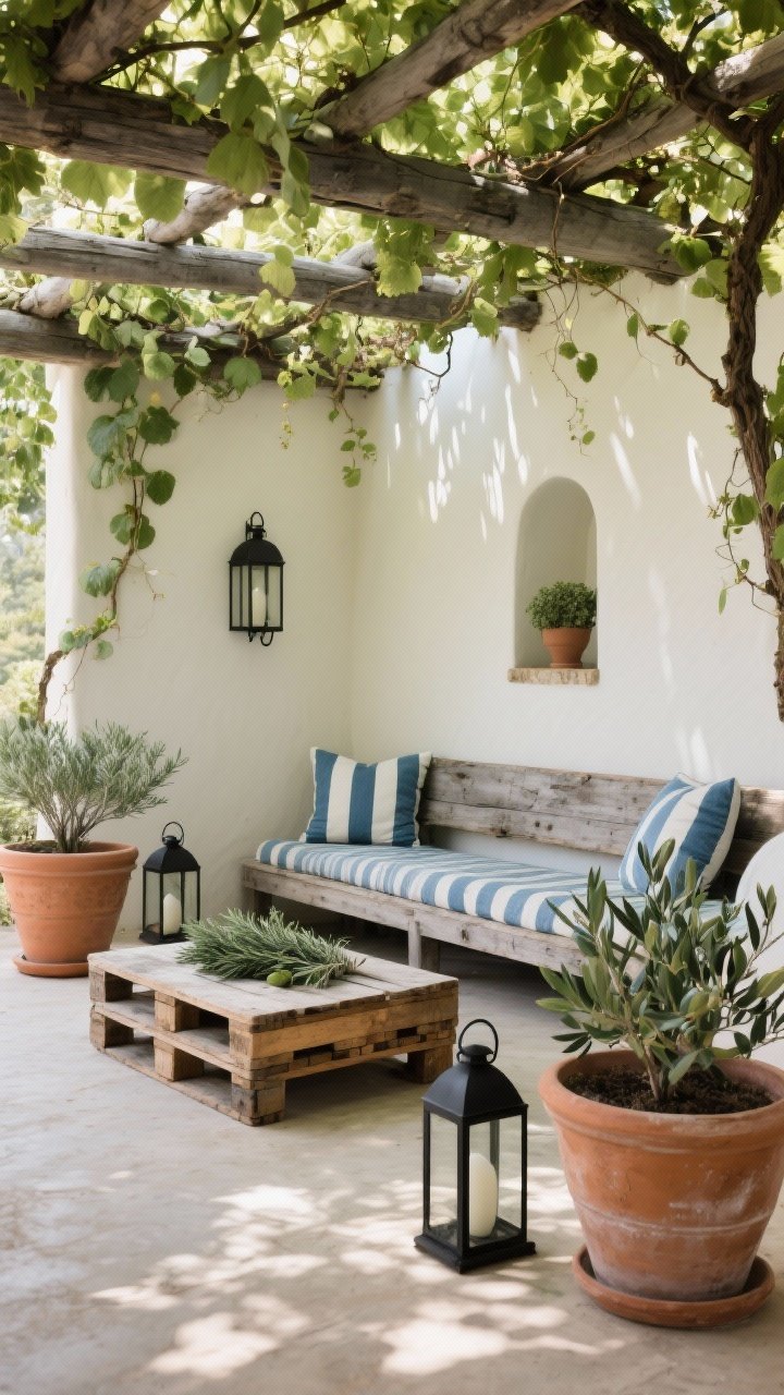 Sous la pergola, installez un banc en bois récup’ avec coussins rayés bleu indigo, une table basse en vieille palette, et des lanternes en métal noir au sol. Des pots en terre cuite XXL accueillent romarin, laurier et olivier nain.