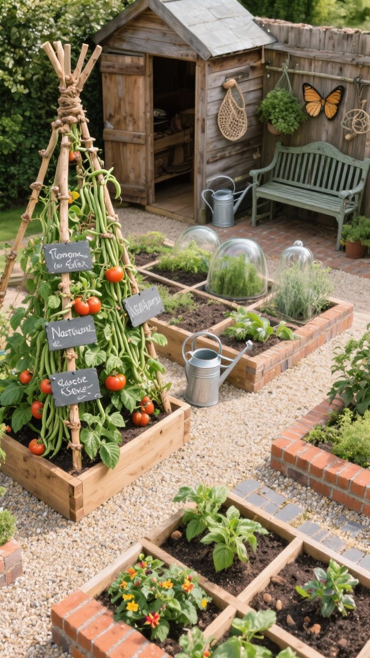 Installez un tuteur tipi en noisetier pour les haricots, un abri d’outils en bois patiné, et des étiquettes en ardoise écrites à la craie. Un banc en fonte face aux rangs d’herbes aromatiques complète l’ensemble.