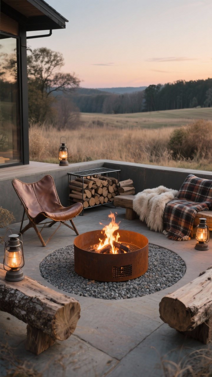 Autour, placez des bancs en rondins et deux fauteuils papillon en cuir vieilli. Une pile de bûches rangée dans un casier en métal, des couvertures en laine et des lanternes à huile donnent ce côté refuge de montagne.