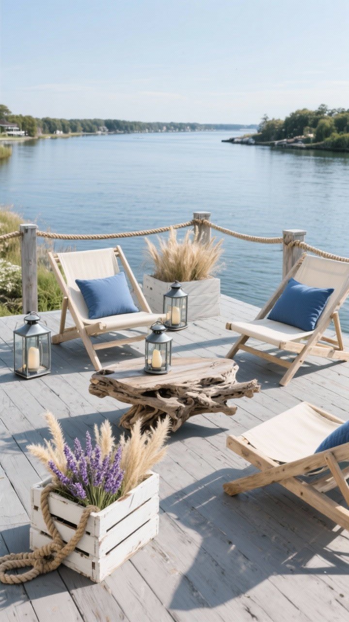 Des chaises longues en toile écrue, des coussins bleu horizon, et des lanternes tempête posées au sol. Quelques cagettes blanchies accueillent lavande, herbe de la pampa et oyats pour un vibe marin rustique.