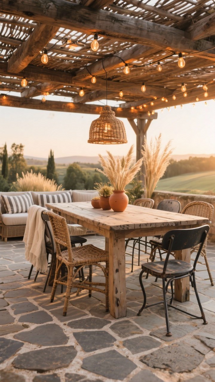 Ajoutez une grande table en bois massif aux bords légèrement usés, entourée de chaises dépareillées en métal vieilli et rotin. Au-dessus, des guirlandes guinguette et une suspension panier en osier diffusent une lumière ambrée au coucher du soleil.