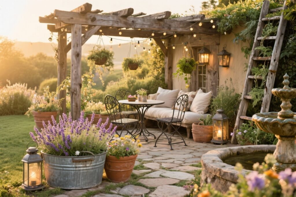 Imaginez des bancs en bois patiné, des lanternes qui scintillent au crépuscule, des plantes qui débordent des bordures, et ce parfum d’herbes aromatiques en fin d’après-midi. Suivez-moi : on fait le tour, comme si on se promenait de coin en coin dans un jardin de rêve.