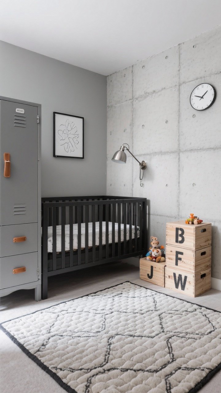 On ose l’indus, mais version bébé: un mur effet béton très lisse, et le reste en gris clair. Les métaux restent brossés (pas trop bruts) pour adoucir.
