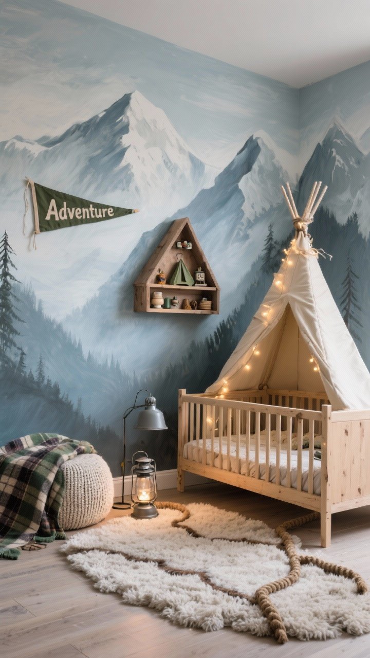 On part en randonnée avec un mur peint en fresque de montagnes brume bleu-gris, et une étagère en forme de maison/cabanon. Accroche un petit drapeau “Adventure” et c’est parti.