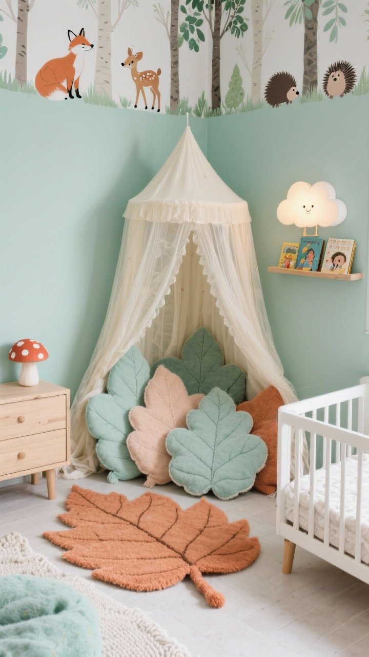 Un conte doux en vert menthe: murs pastel, frise autocollante de petits renards, faons, hérissons. On crée un coin lecture sous un ciel de lit en gaze crème, avec des coussins feuille.
