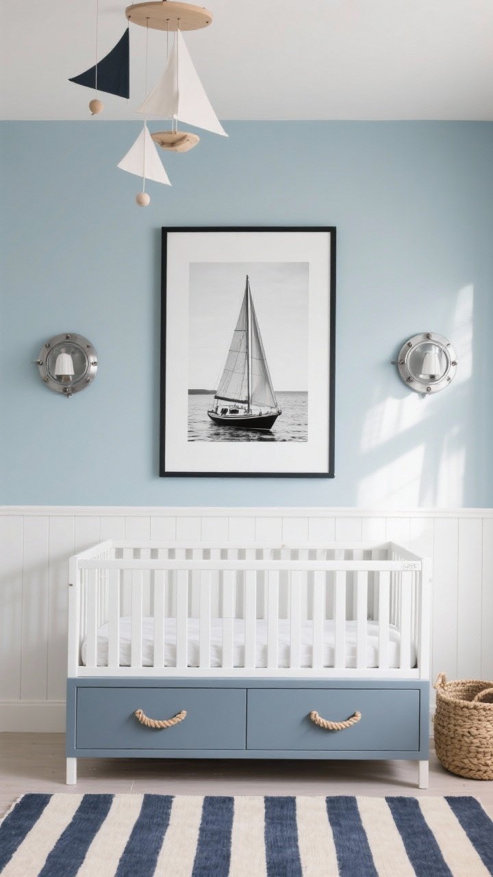 Lit à barreaux blanc, commode bleu gris, et tapis rayé bleu marine/écru. Accents corde sur les poignées, appliques style hublot en métal brossé, et un mobile en formes de voiles pour bercer.