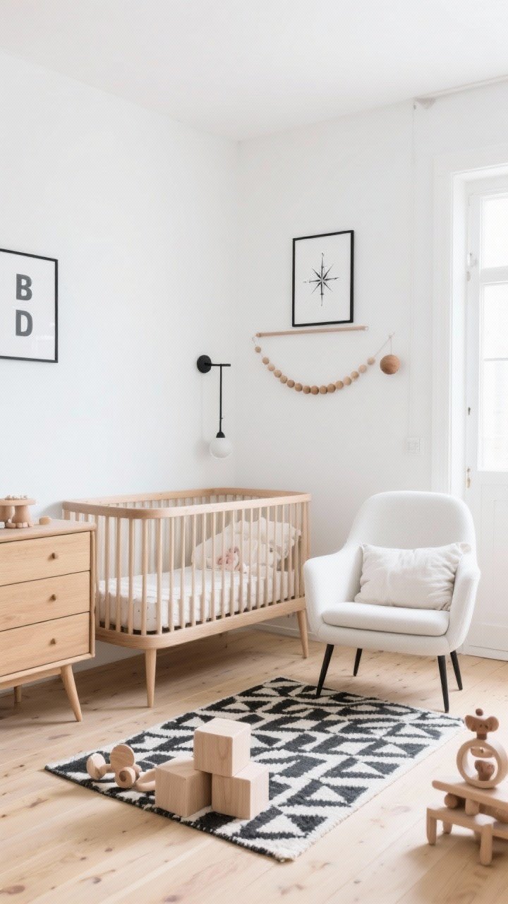 Le lit à barreaux arrondis en frêne, la commode à pieds compas, et un fauteuil lacté dessinent la silhouette nordique. Un tapis géométrique noir et blanc, des housses en mousseline et une guirlande de boules boisées finissent l’ensemble.
