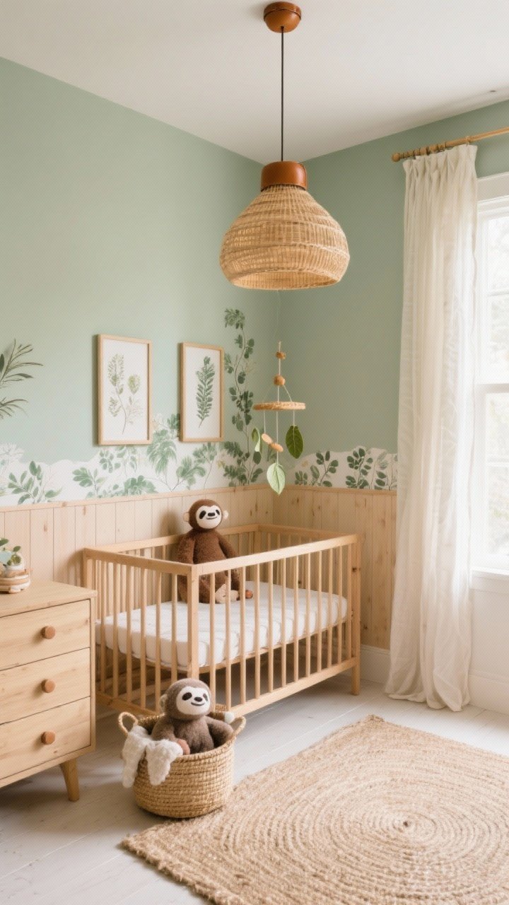Imagine une pièce baignée de lumière, avec des murs vert sauge très doux et un soubassement en bois clair pour réchauffer. Au mur, un papier peint feuillage discret derrière le lit bébé ajoute juste ce qu’il faut de jungle sans agresser l’œil.