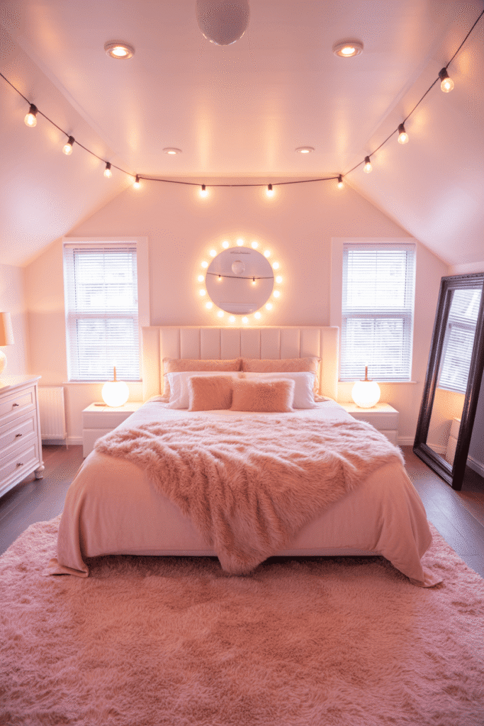 Osez le contraste ! Cette chambre joue sur la dualité entre la douceur du rose et la force graphique du noir. Le lit, véritable nuage de confort, capte la lumière matinale sur son couvre-lit en peluche.
