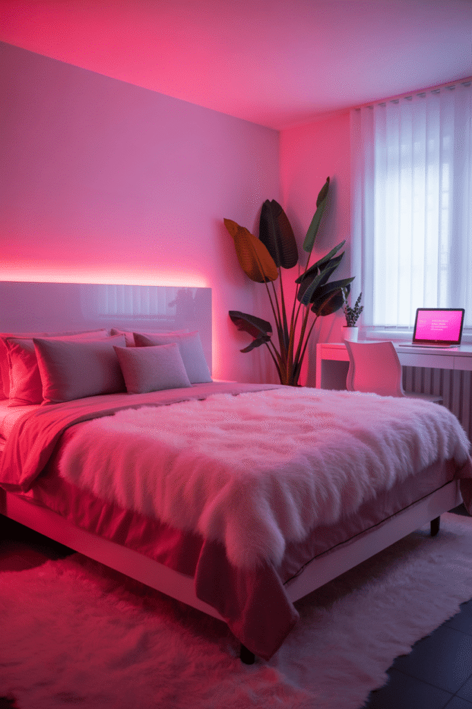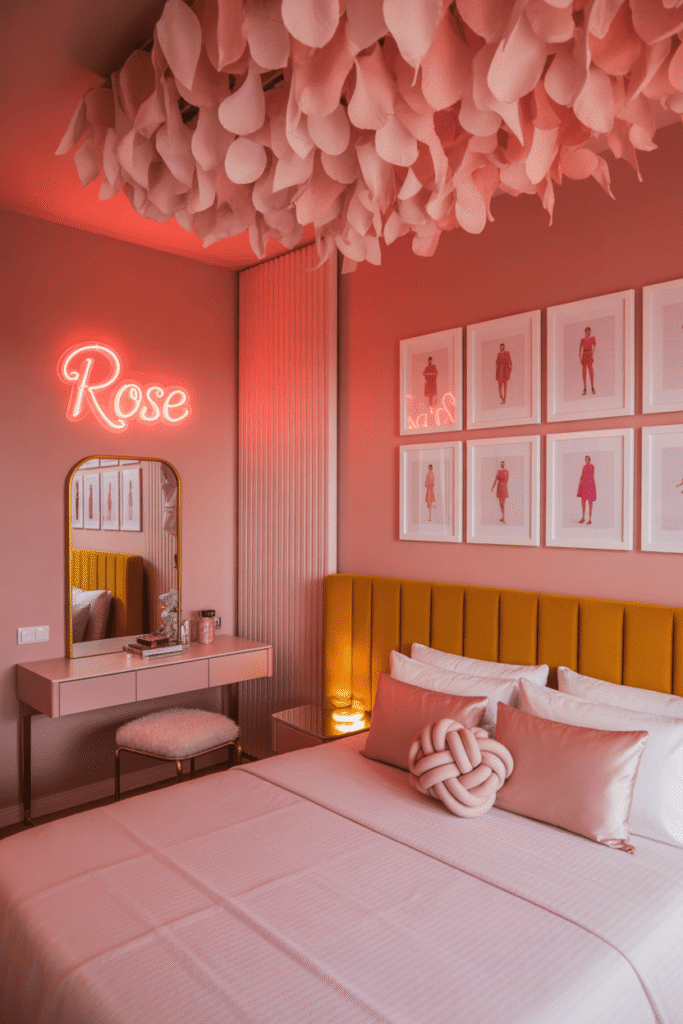 Cette chambre « Trendy » mixe habilement les roses doux avec du mobilier à la pointe de la mode. Le lit rose trône au centre, garni de coussins moelleux, tandis qu’une petite table expose une décoration délicate.