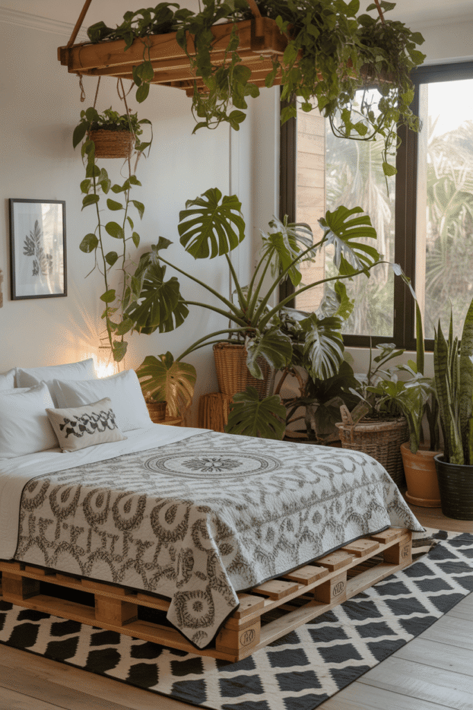 Le bohème sait aussi se faire chic et invitant. Les couvertures beiges apportent une élégance décontractée au lit en bois. Au sol, un tapis rond en jute structure l’espace par sa texture brute. Les plantes vertes, disposées dans les angles, finissent d’habiller la pièce avec vie et fraîcheur.