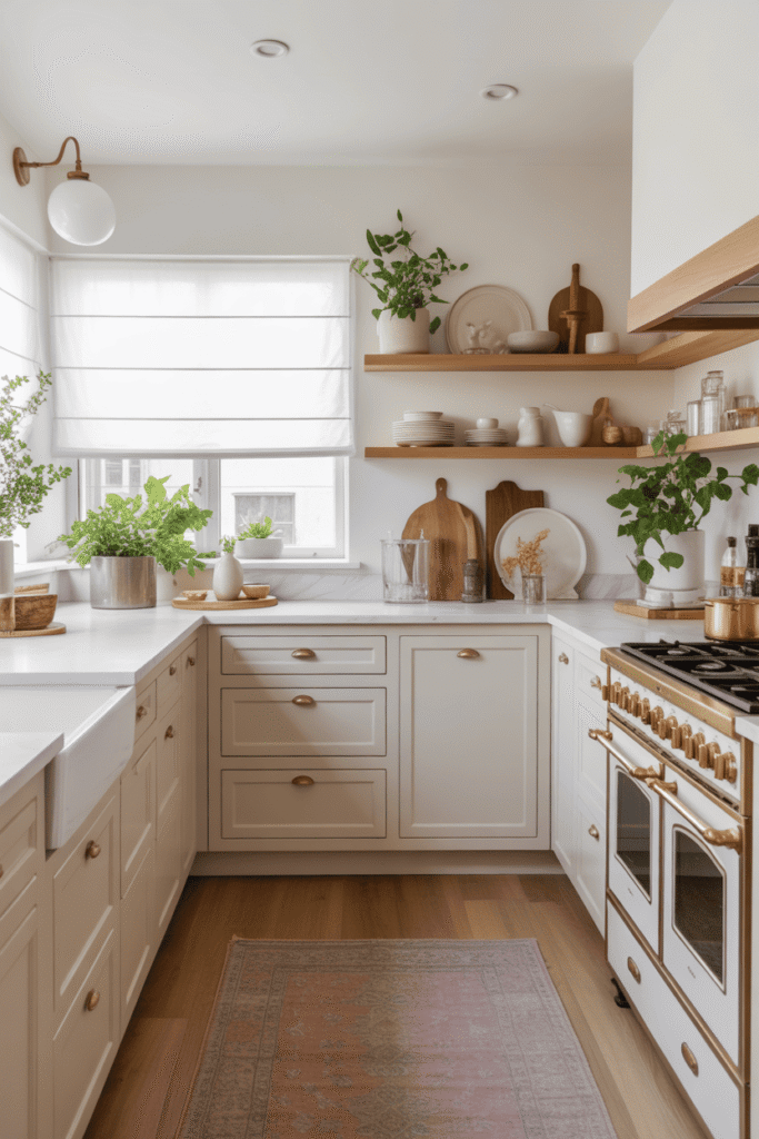 Parquet (ou imitation vinyle/carrelage de qualité), placards, planches à découper ou étagères flottantes en bois sont indispensables. Ces touches organiques réchauffent l’atmosphère et délimitent les zones, évitant ainsi l’écueil d’une cuisine blanche trop froide et sans relief.