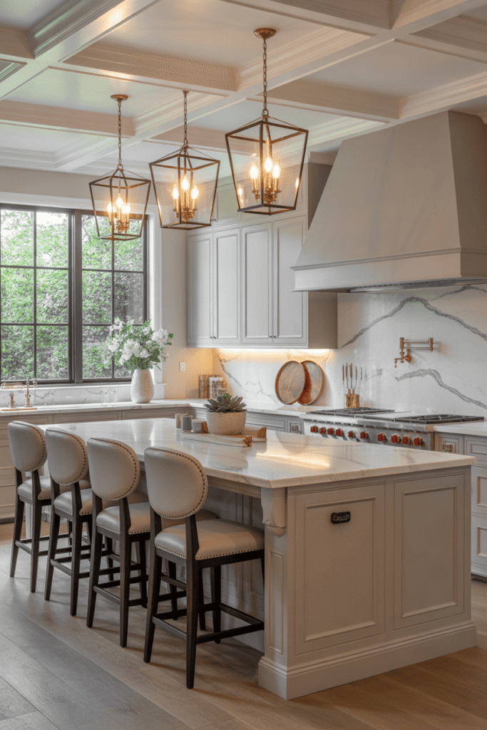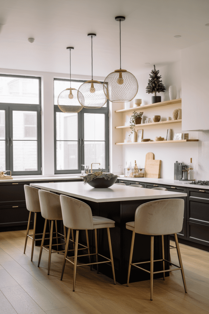 Qui a dit que le style fermier ne pouvait pas être chic ? Sur une base de murs blancs lumineux, intégrez des touches dorées via les luminaires et la quincaillerie pour une note de prestige.