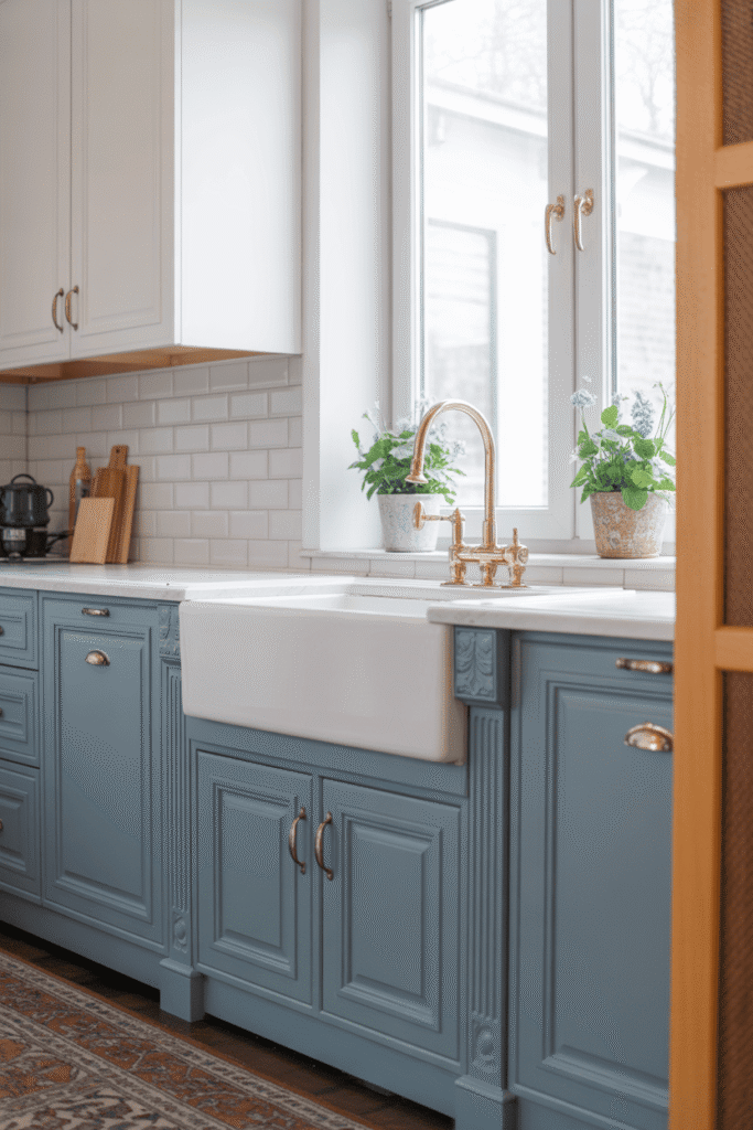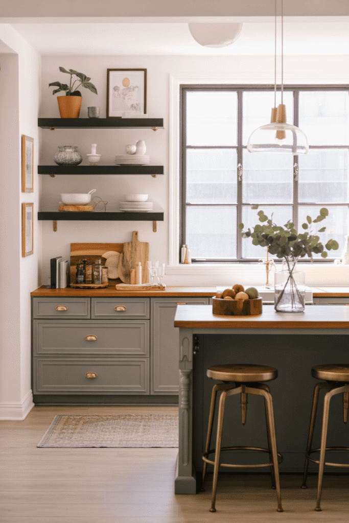 Cette cuisine maîtrise l’art du contraste doux. Elle joue sur une palette de neutres sophistiqués où le gris/vert désaturé des placards rencontre la chaleur du bois sur l’îlot. Les touches modernes sont apportées par la quincaillerie dorée et une crédence en marbre luxueuse. L’évier timbre d’office surdimensionné et les fenêtres à carreaux noirs ancrent le décor dans une ambiance décontractée et authentique.