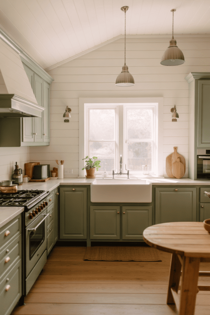 L’audace de la couleur ! Associer un vert unique à du lambris blanc crée une cuisine pleine de caractère. Cette teinte végétale personnalise l’espace, tandis que les accents en bois renforcent le côté « retour à la terre ». C’est l’option idéale pour ceux qui souhaitent une connexion avec la nature au cœur de leur maison.