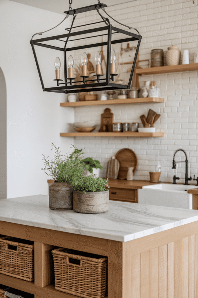 Pour dynamiser une cuisine dominée par le bois, rien de tel que l’éclat de la pierre blanche brillante. Le contraste entre les plans de travail lumineux et les matériaux naturels attire le regard. Les accessoires farmhouse, comme les paniers tressés sous l’îlot, allient rangement pratique et esthétique soignée.