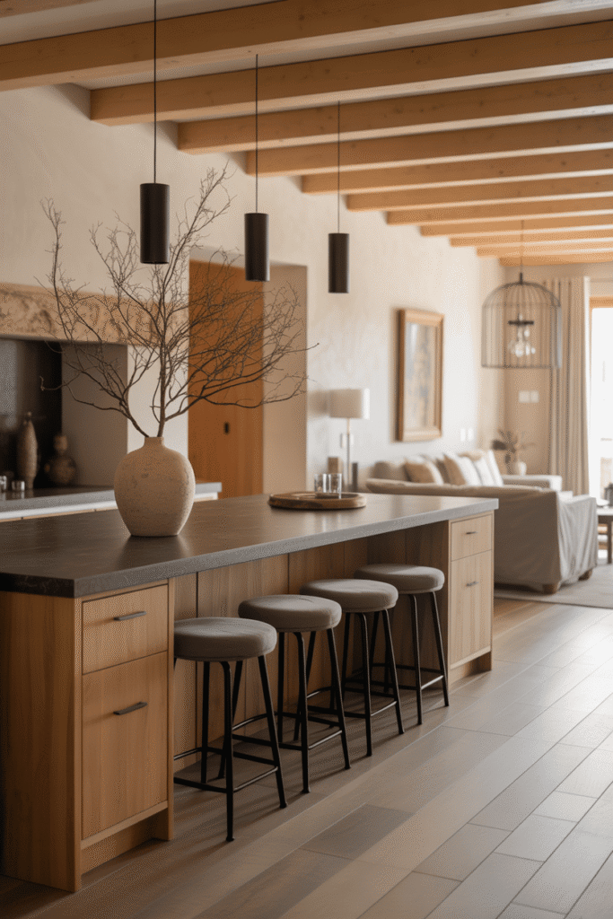 L’îlot central, lui, invite à la convivialité décomplexée. Avec son plan de travail en bois robuste, ses placards sombres et ses tabourets rustiques, il devient une zone de préparation « sans souci ». C’est l’agencement parfait pour ceux qui aiment cuisiner sans craindre le désordre.
