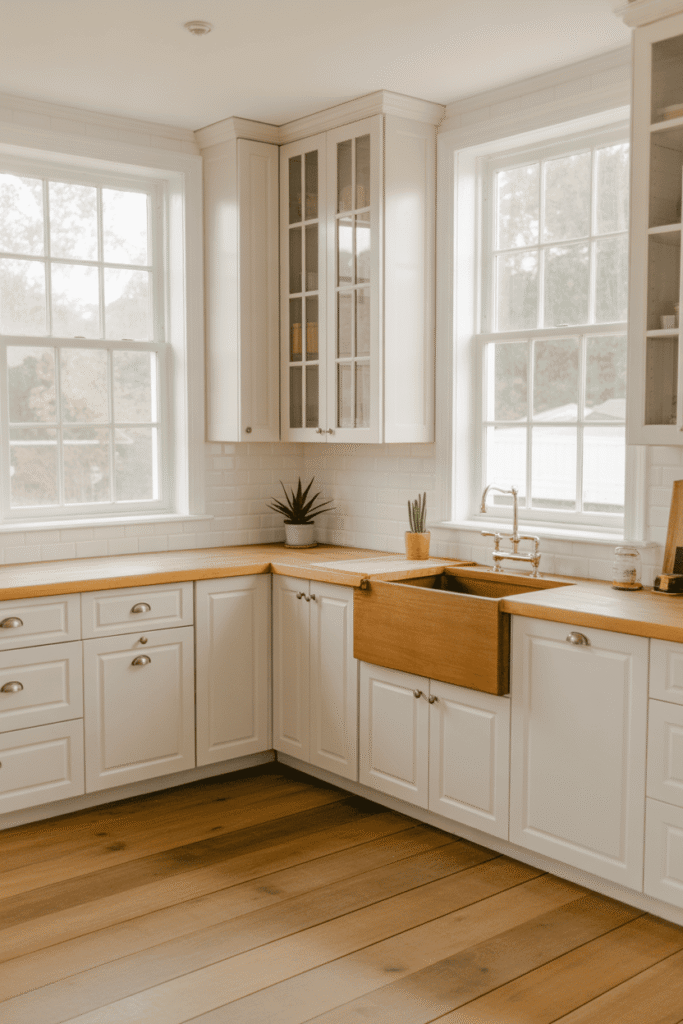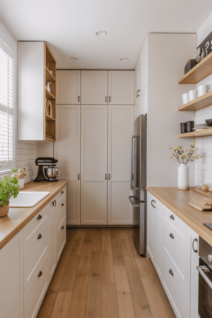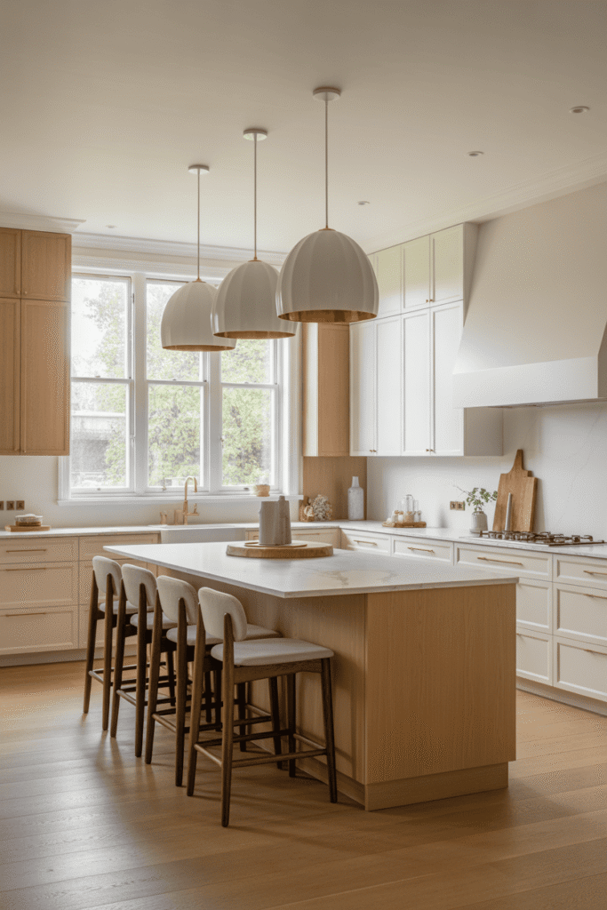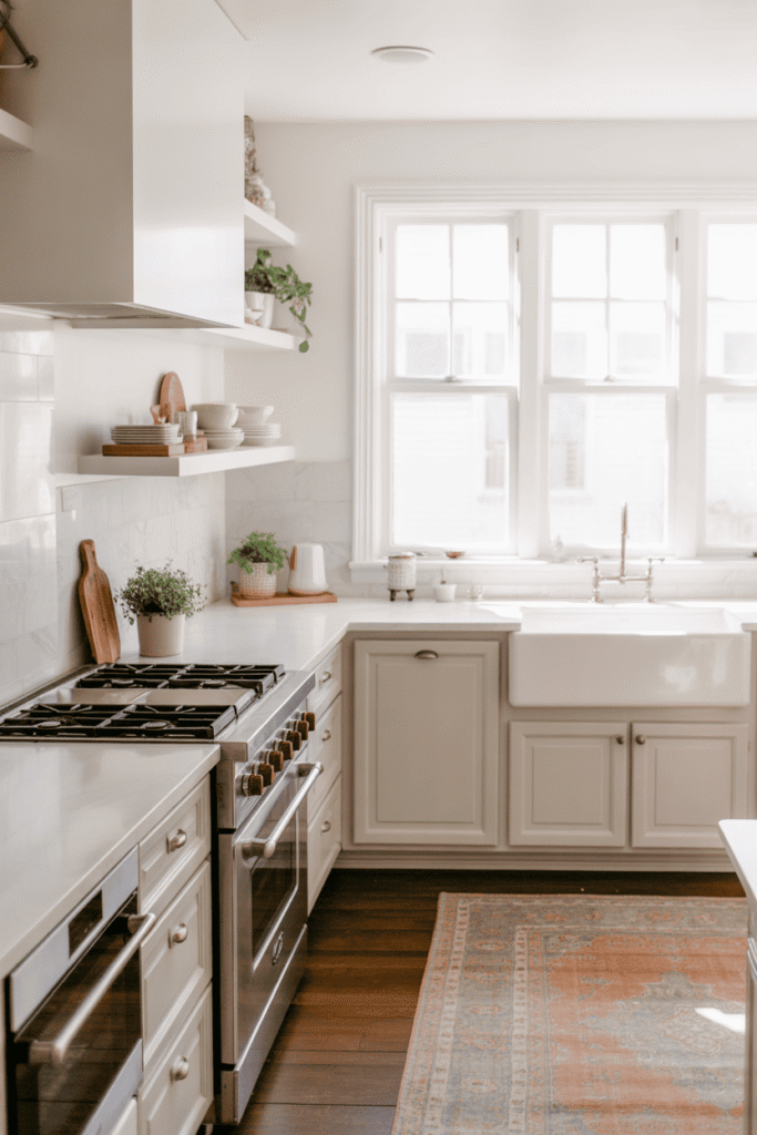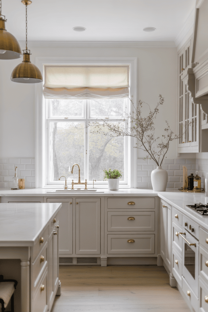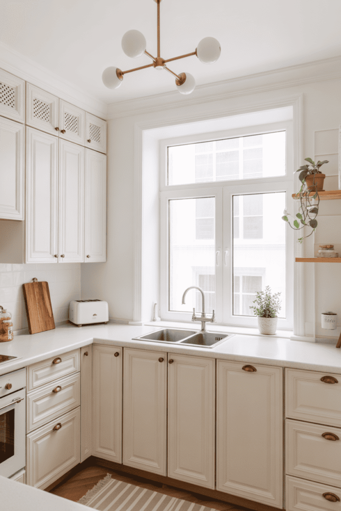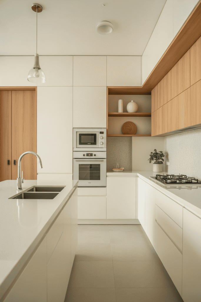 L’élégance réside souvent dans la retenue. Ce design mise sur un charme discret en associant le blanc à des placards beige doux, créant une atmosphère à la fois stylée et chaleureuse. La lumière rebondit délicatement sur les comptoirs polis, tandis que la décoration minimaliste souligne la modernité de l’ensemble sans le surcharger.