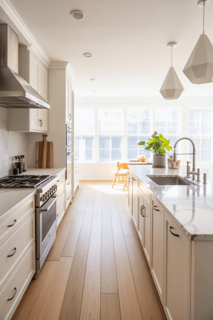 Ici, la lumière est l’élément central du décor. Cette cuisine moderne rayonne, laissant le soleil inonder les larges plans de travail. Les placards, d’une simplicité étudiée, sont véritablement élégants. La clarté se reflète avec un éclat doux sur chaque surface, offrant le mariage parfait entre style pointu et confort vivifiant.