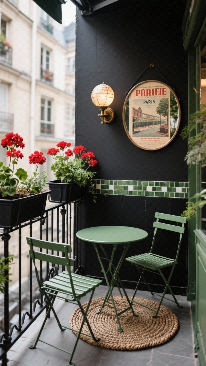 Habille la rambarde de jardinières noires remplies de géraniums rouges et d’herbes aromatiques. Une applique murale globe, une affiche vintage encadrée en extérieur, et un miroir rond pour agrandir visuellement: ton café du coin à domicile.