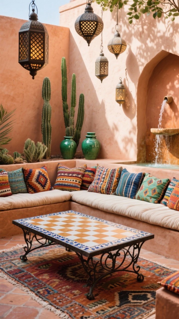 Pose une table en fer forgé avec plateau zellige, un tapis extérieur aux motifs losanges, et suspends des lanternes ajourées de tailles différentes. Ajoute des cactus en jarres vernissées vert émeraude et une fontaine murale pour le clapotis.