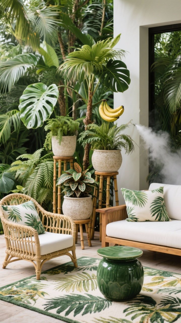 Le mobilier reste léger: fauteuils en corde tressée, canapé bas en teck et table d’appoint en céramique émaillée vert profond. Ajoute un tapis à motifs végétaux, des coussins feuille de palmier, et un brumisateur discret pour l’effet rainforest.