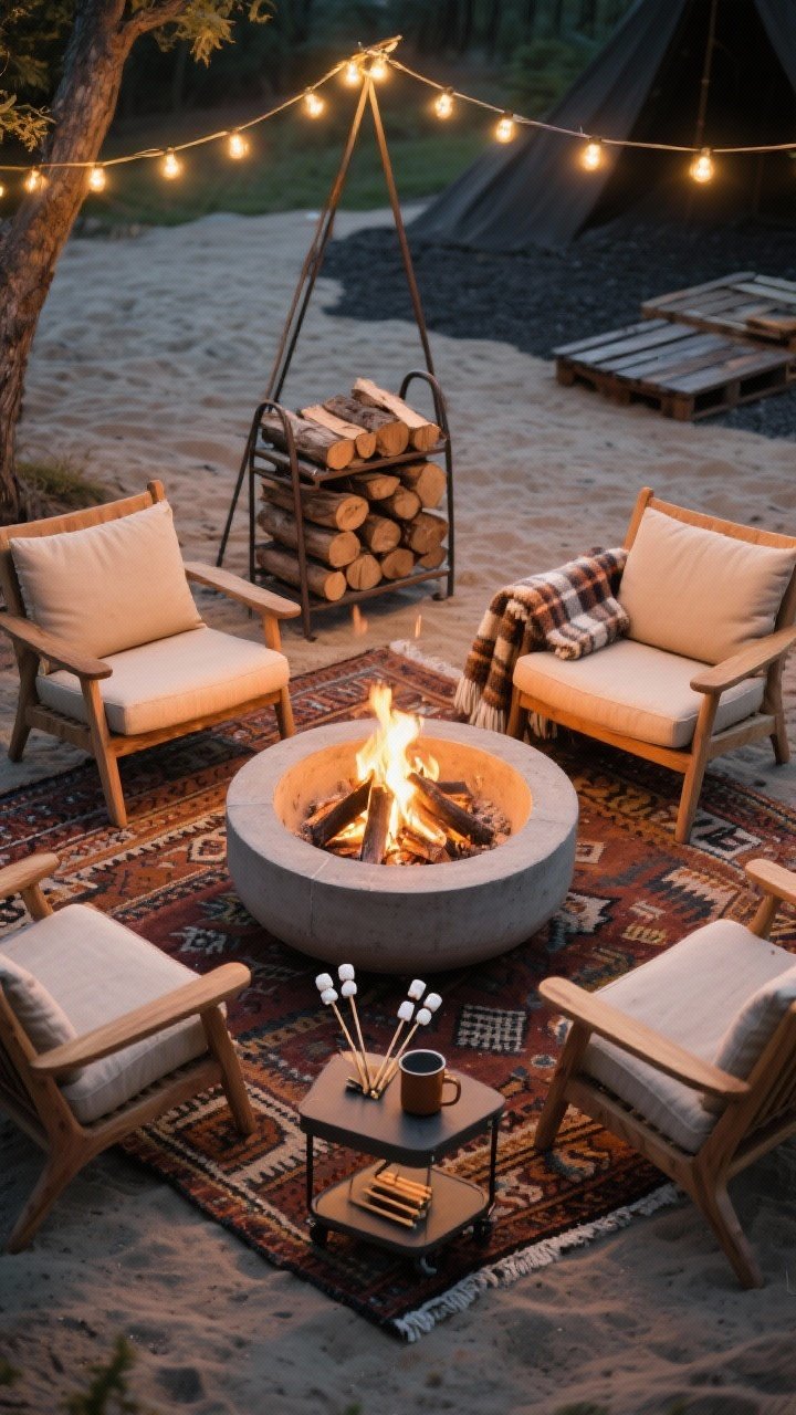Place le feu au centre. Opte pour un brasero rond en béton, entouré de quatre fauteuils bas en acacia aux coussins sable. Un tapis extérieur façon kilim réchauffe visuellement, et des bûches rangées dans un casier métal ajoutent la touche authentique.