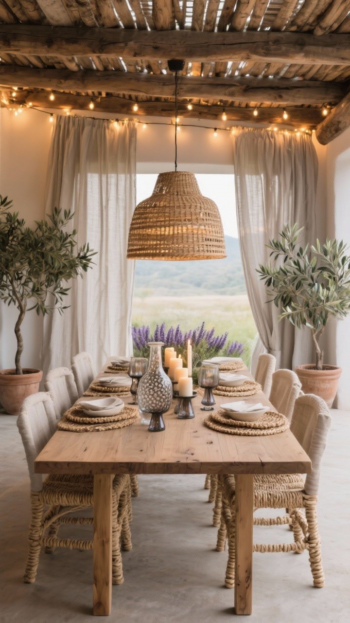 Au-dessus, guirlandes LED chaudes et une suspension en rotin. Sur la table: vaisselle en grès artisanal, carafe en verre bullé, sets de table en raphia. Encadre l’espace avec des oliviers en pot et des lavandes pour le parfum.