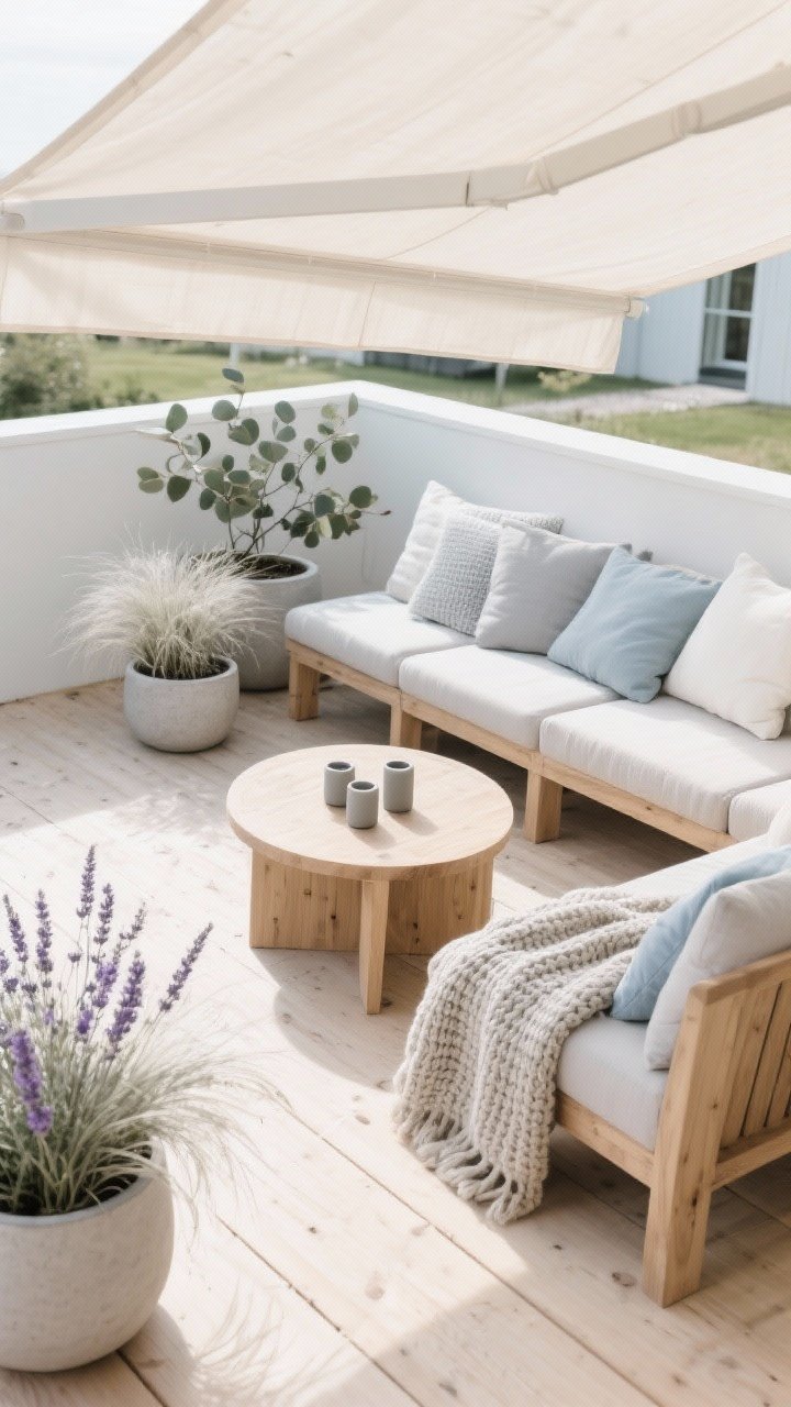 Ajoute une grande jarre en terre cuite, un olivier en pot et un tapis d’extérieur rayé pour la douceur sous les pieds. Le coin repas se fait simple et chic: table en bois brut, chaises blanches ajourées, et lanternes en métal perforé qui scintillent au crépuscule.