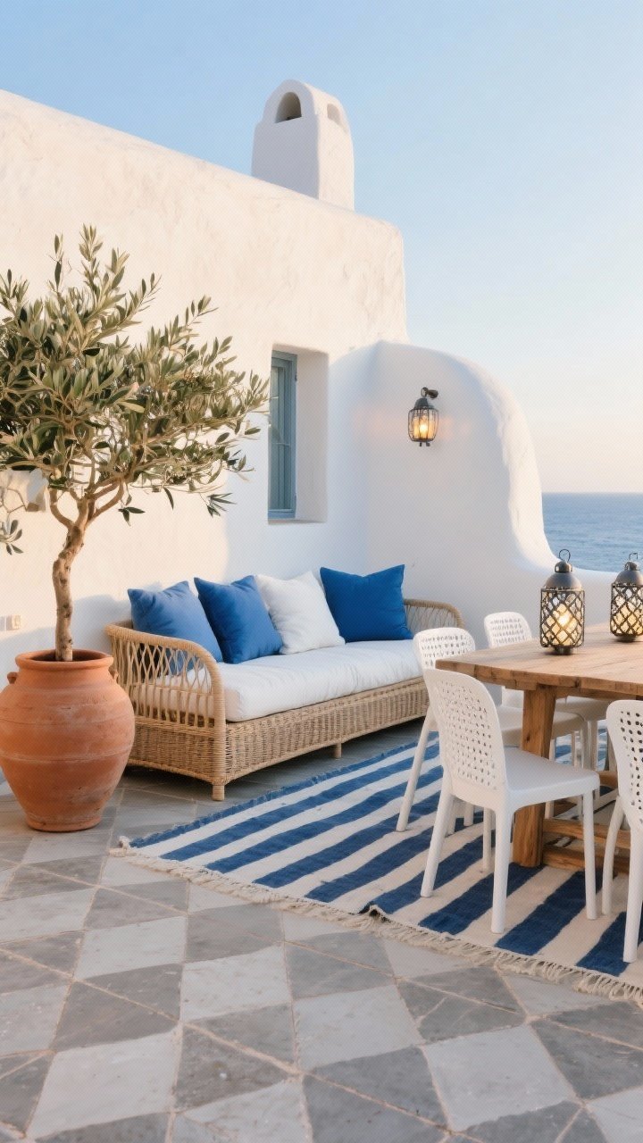 Imagine une terrasse inondée de lumière, avec des murs chaulés blancs et des touches de bleu Santorin. Le sol en carreaux de ciment géométriques donne le rythme, tandis qu’un canapé d’angle en rotin clair habillé de coussins bleu cobalt et blanc promet des siestes au soleil.