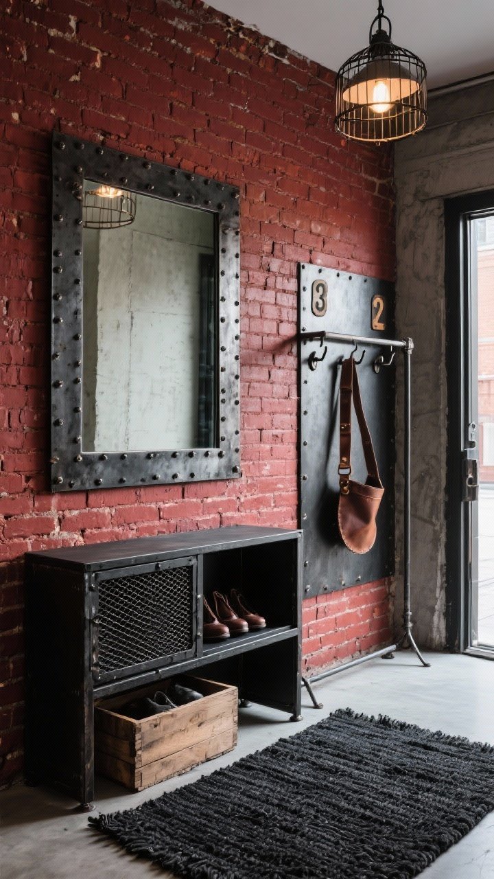 Caractère brut et assumé. Un pan de mur en brique apparente (ou papier peint trompe-l’œil), console en acier noir avec étagères grillagées, et un portant façon atelier.