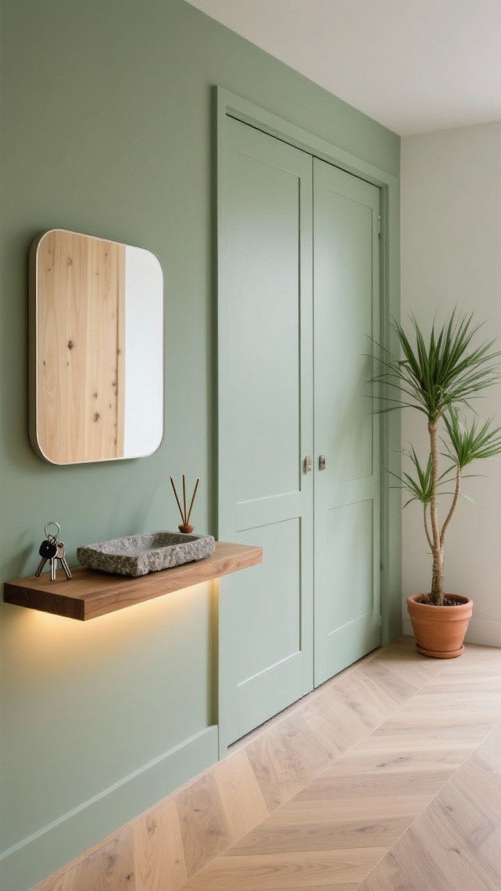 Ambiance spa dès la porte. Murs vert sauge très doux, sol en parquet chêne clair, placard toute hauteur avec portes lisses peintes ton sur ton pour disparaître dans le décor.