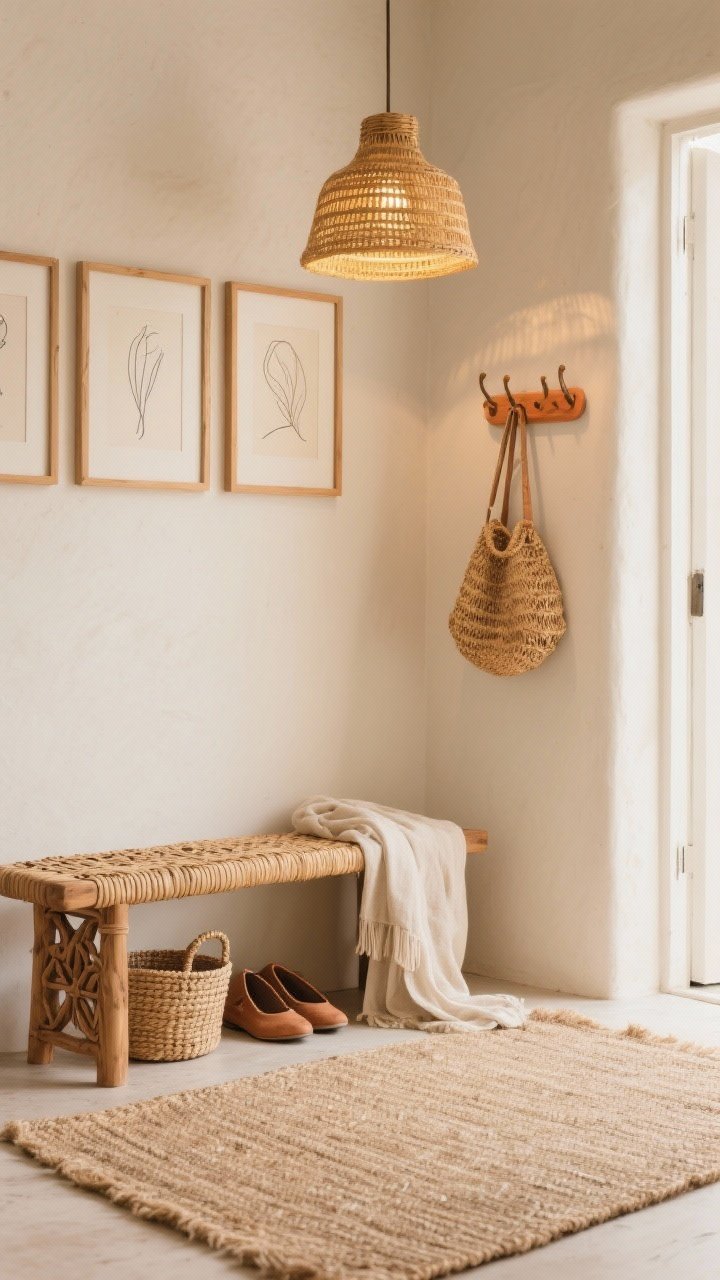 Tu entres et tout respire. Murs beige sable, tapis en jute, et un banc bas en bois sculpté avec assise en corde tressée. C’est la douceur boho sans tomber dans le bazar.