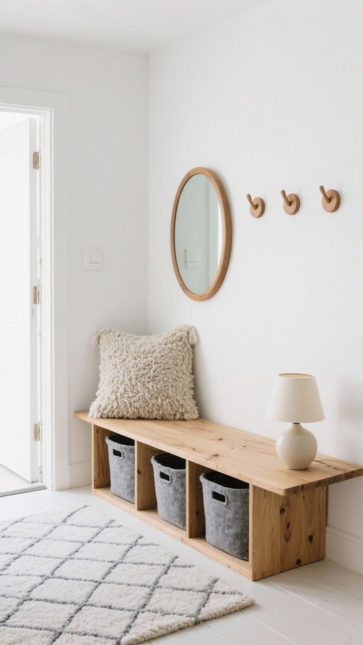 Au mur, patères en boule de bois, miroir ovale à cadre chêne, et un tapis moelleux motif losanges. Une petite lampe d’appoint en céramique crème ajoute une chaleur diffuse.