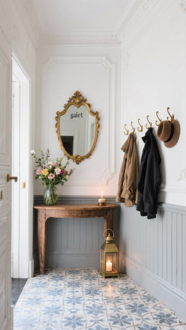 Une console en bois patiné hyper élégante, grand miroir trumeau doré, et bouquet de fleurs fraîches. Des patères en laiton forment une ligne parfaite pour manteaux et chapeaux.