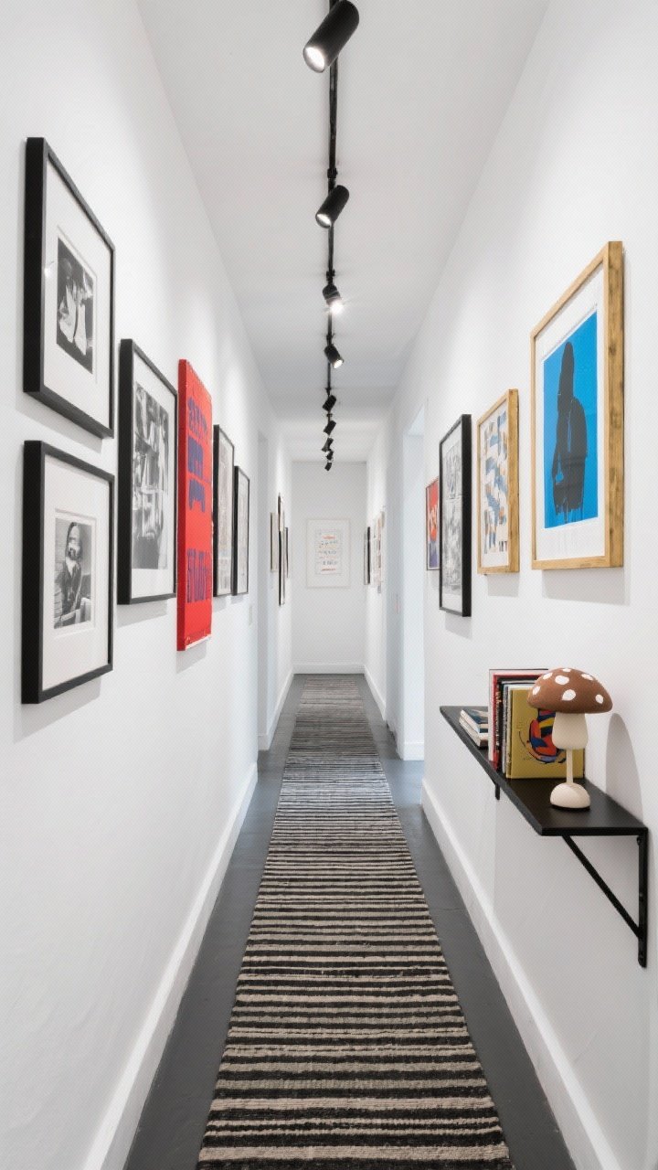Ton entrée devient un mini musée. Murs blancs habillés d’une gallery wall bien pensée : cadres noirs et laiton, photos noir et blanc, affiches colorées, quelques sérigraphies.