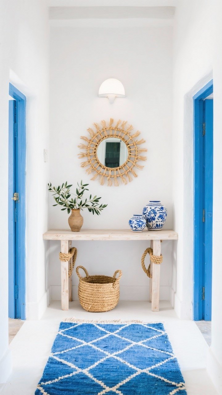 Une console en bois blanchi avec poignées en corde, un miroir soleil en raphia, et quelques branches d’olivier dans une jarre. Frais, simple, invitant.