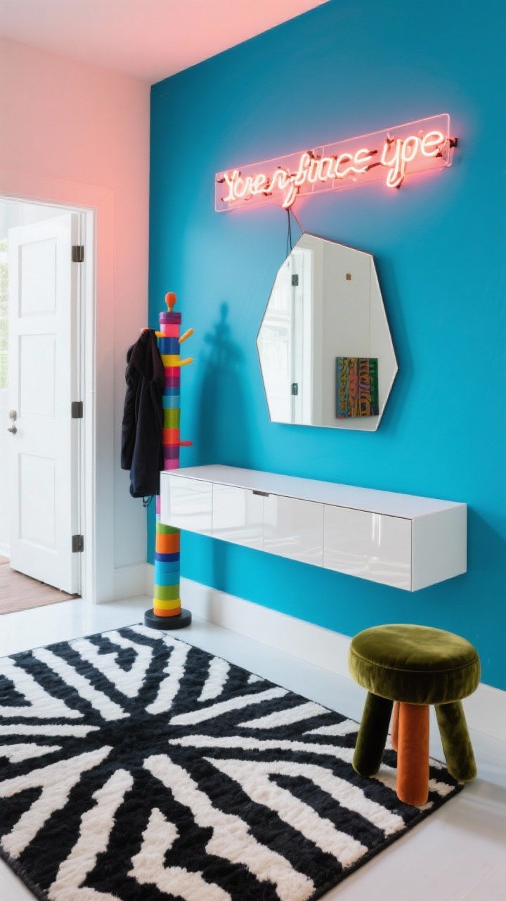 On s’amuse. Un mur accent en bleu électrique ou corail, console étroite en laque blanche, et un néon déco avec une phrase courte au-dessus. Ambiance galerie pop et good vibes.