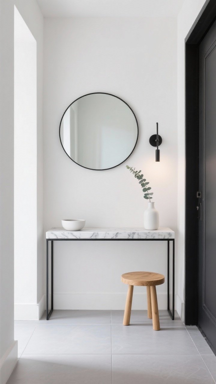 Imagine une entrée nette comme une page blanche, avec des lignes impeccables et des touches contrastées. Murs blanc cassé, sol en carreaux grand format gris clair, et une fine console en métal noir mat avec plateau marbre.