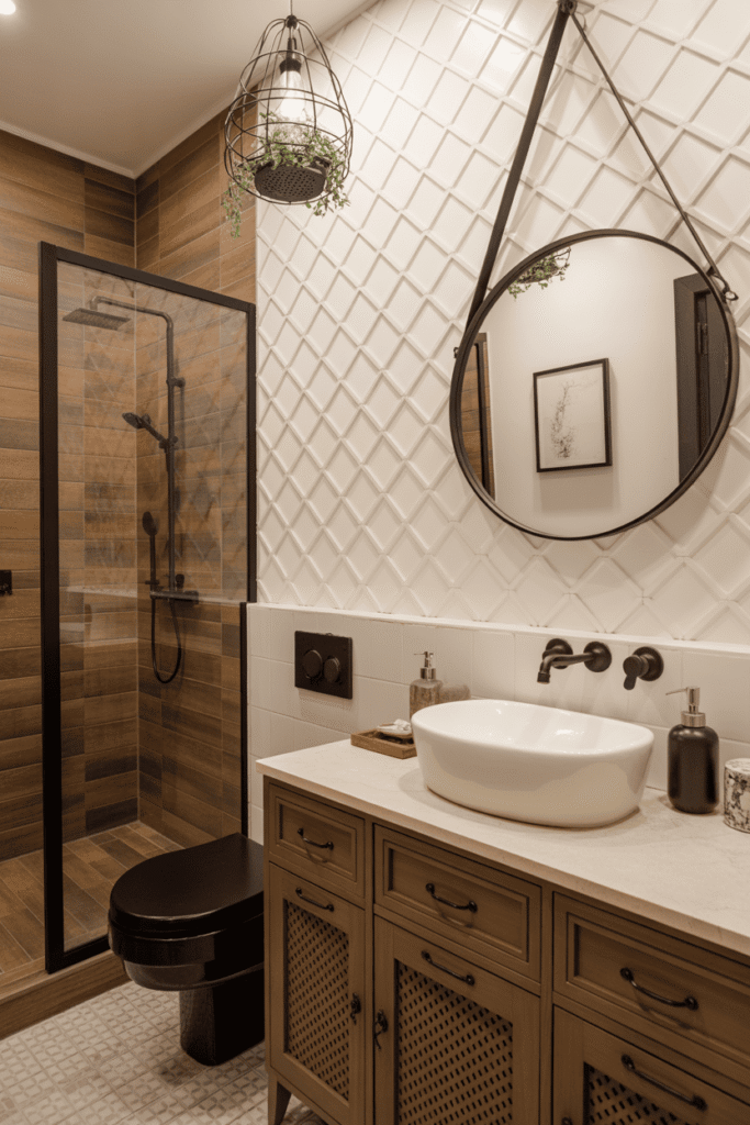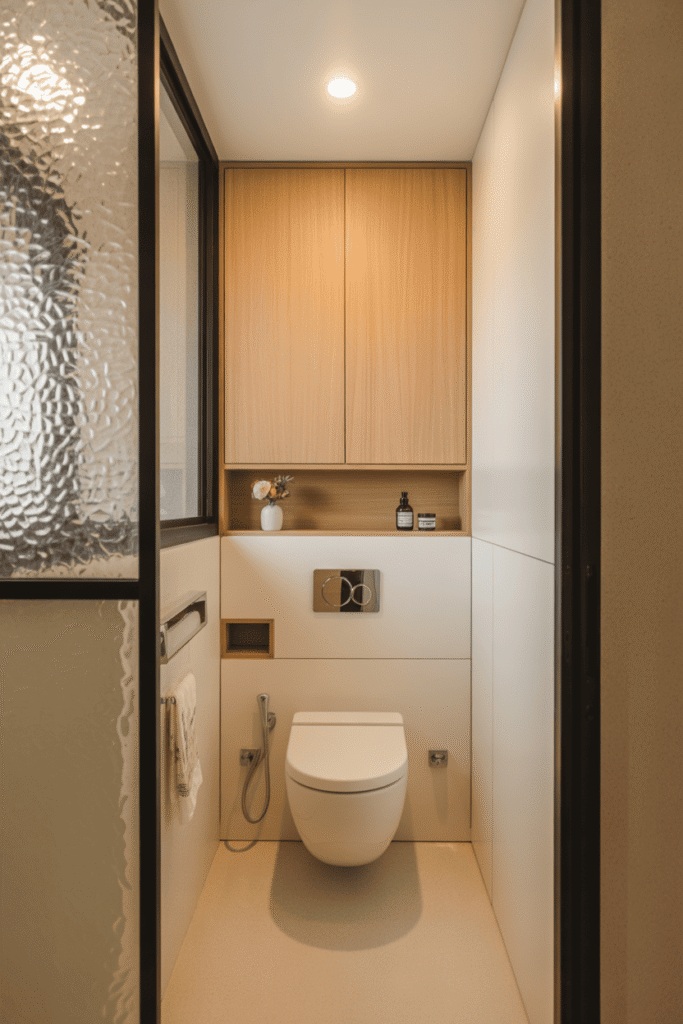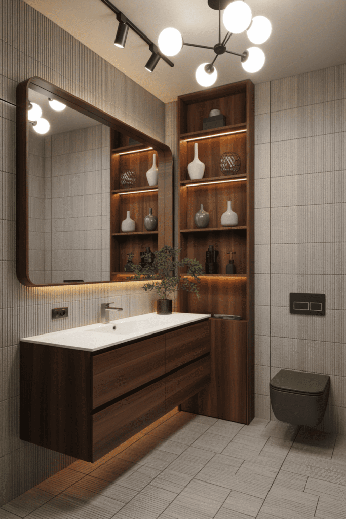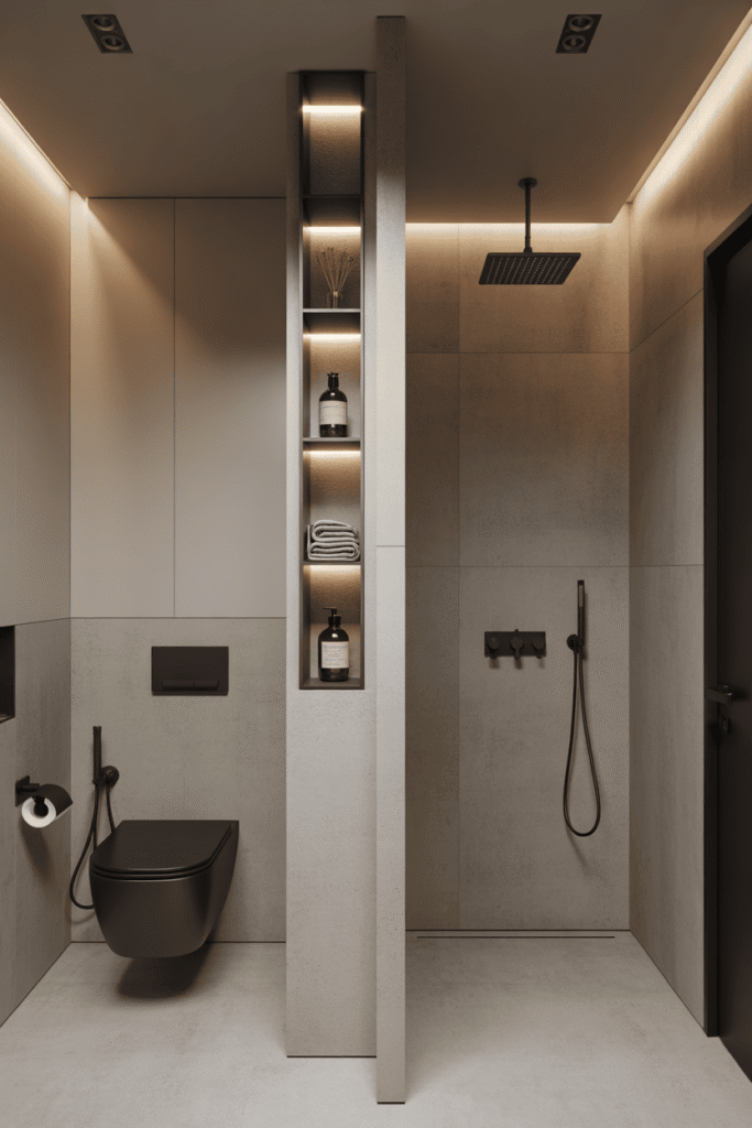Ne sacrifiez plus l’élégance sur l’autel de la fonctionnalité. Cette salle de bain moderne ouvre la pièce grâce à des murs clairs, créant une ambiance subtilement cosy. Les étagères compactes sont là pour la praticité. C’est l’aménagement parfait pour les appartements urbains où chaque centimètre compte.