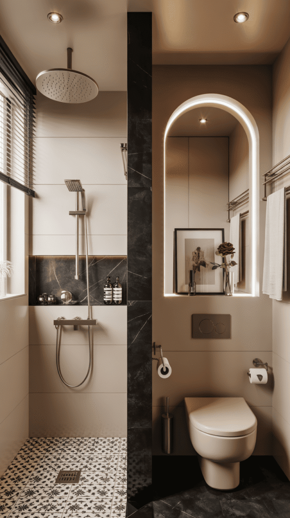 Le luxe n’a pas besoin de grands espaces pour s’exprimer. Ici, l’élégance transforme l’exiguïté en atout charme. Les teintes claires inondent la pièce d’une lumière aérienne, amplifiée par des jeux de miroirs. Le carrelage, avec sa texture lisse et polie, scintille pour rehausser l’aspect précieux de ce petit bijou.