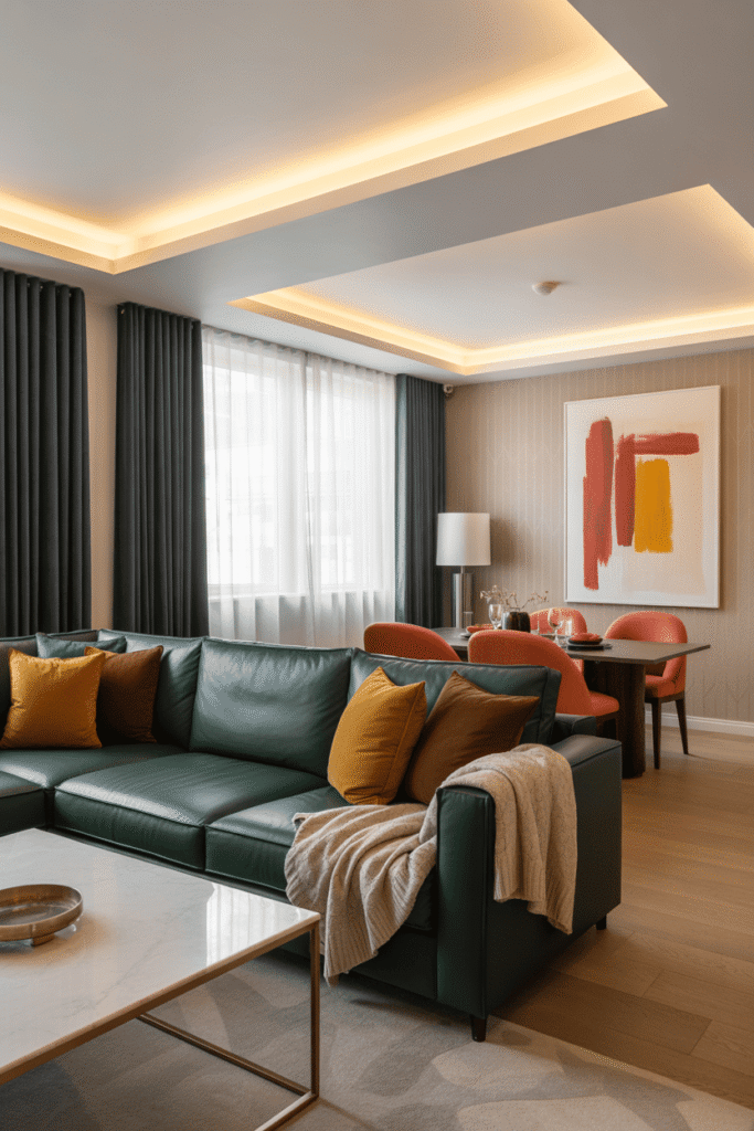Qui a dit que les petits espaces devaient être blancs ? Ce salon contemporain ose les teintes vibrantes sur une base minimaliste. Les objets déco colorés créent des points focaux dynamiques, attirant l’œil et donnant du caractère. Les murs neutres servent de toile de fond idéale pour ce jeu visuel ludique et moderne, sublimé par un éclairage soigné.