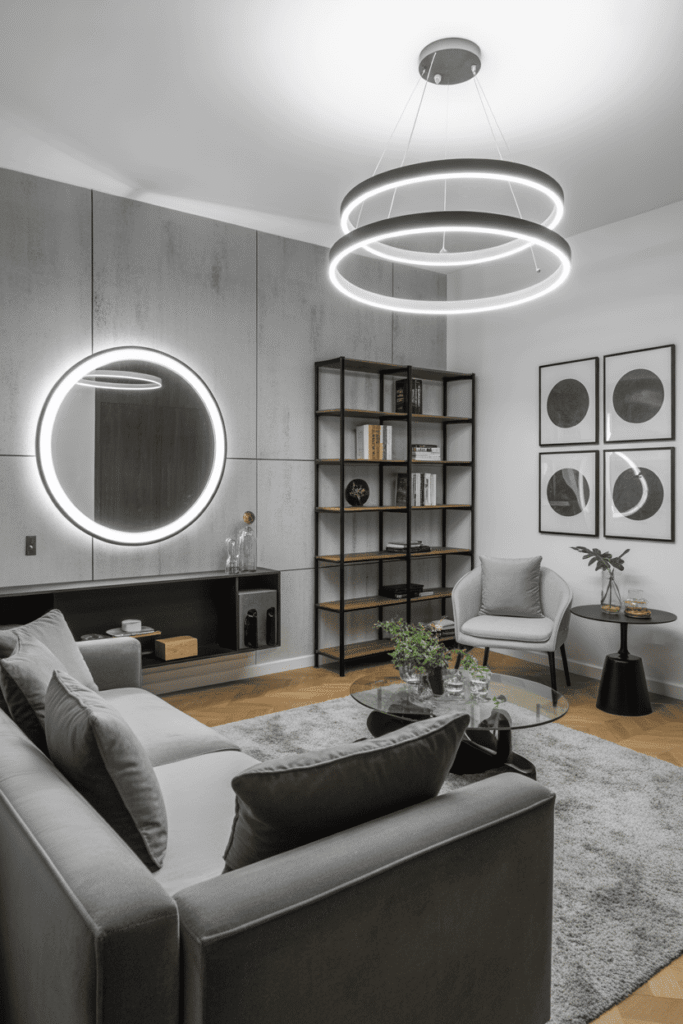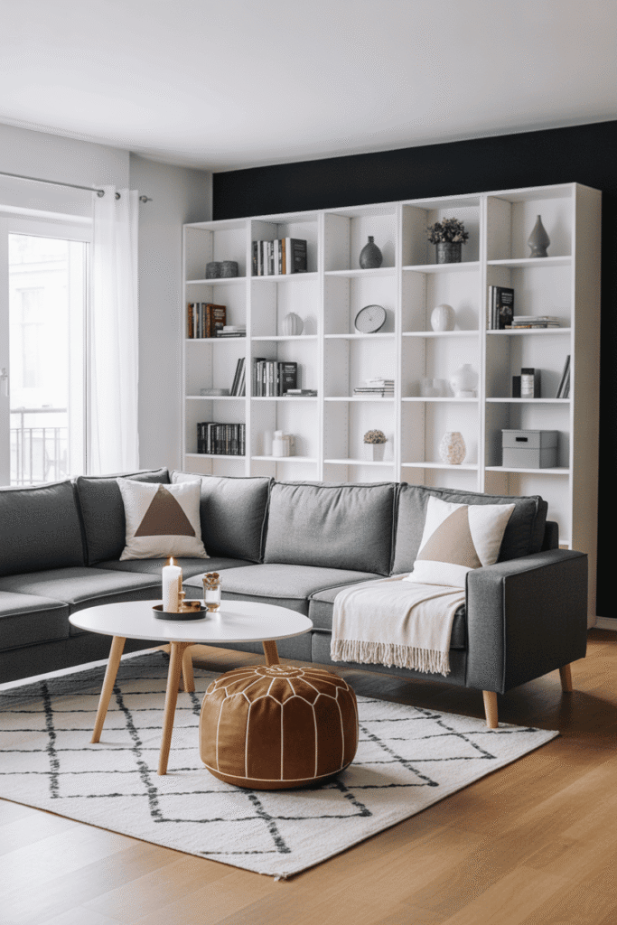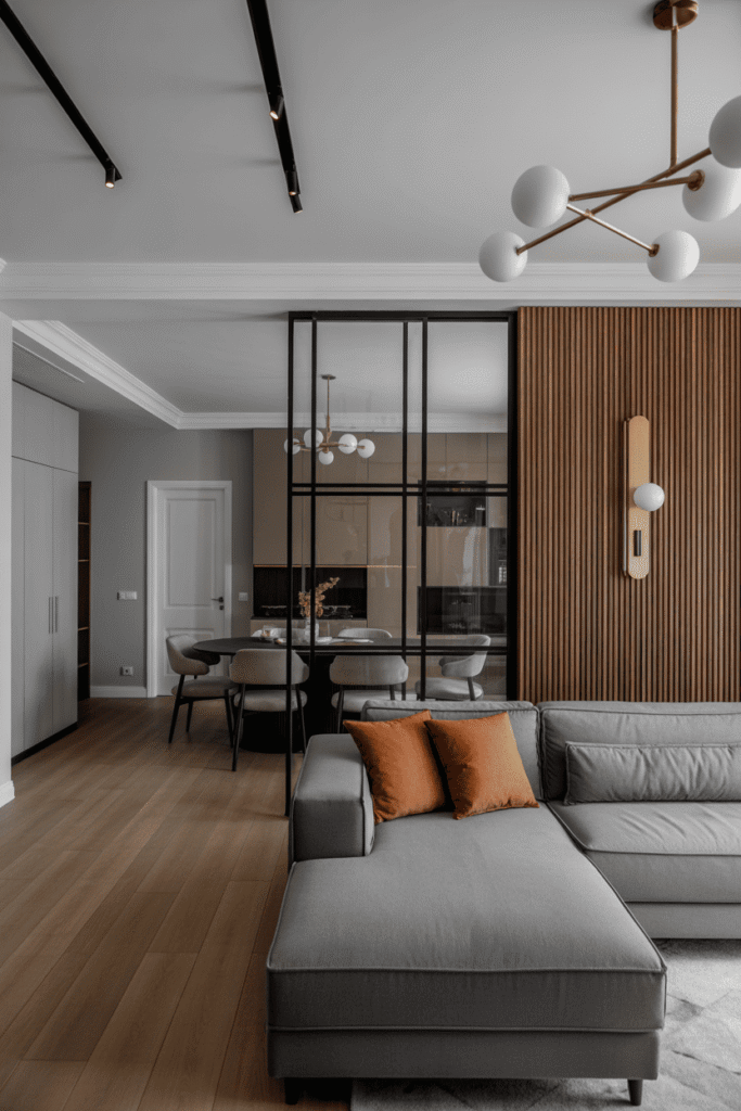 Dans cet appartement, le design épuré rencontre l’agencement ouvert pour contrer le manque de place. Les canapés compacts s’intègrent parfaitement sans alourdir la pièce. Le gris neutre des murs équilibre la décoration, tandis qu’un éclairage chaleureux vient adoucir l’esthétique moderne, rendant l’espace aussi beau que vivable.