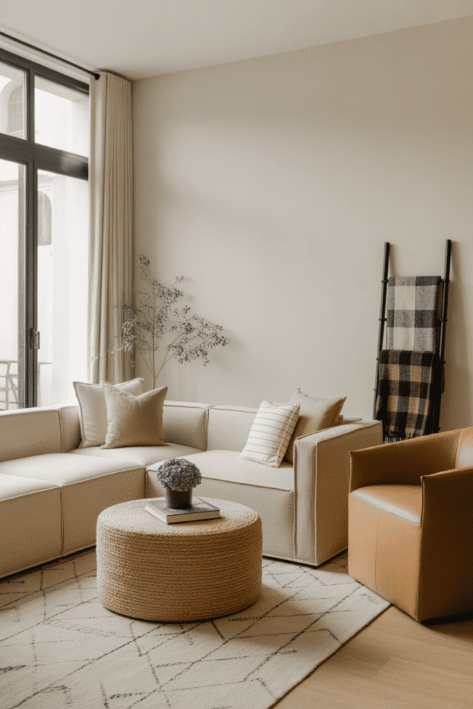 Le charme réside ici dans le raffinement minimaliste. Les tons neutres se marient à une décoration subtile pour un rendu ultra-soigné. L’agencement des canapés est pensé pour maximiser la convivialité tout en préservant la liberté de mouvement. Au sol, un tapis texturé apporte la touche de chaleur indispensable à ce petit espace élégant.