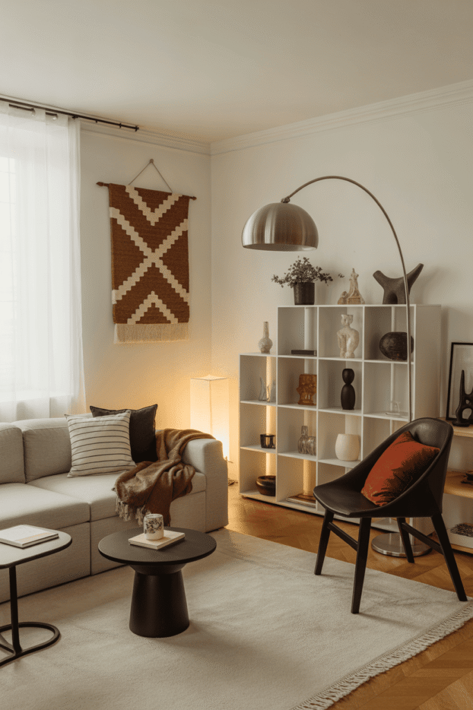 Ce salon prouve qu’on peut allier modernité et esprit cocooning, même dans un mouchoir de poche. L’astuce réside dans le choix d’assises compactes qui facilitent une circulation fluide. Les étagères flottantes exploitent la verticalité des murs pour le rangement sans empiéter sur l’espace vital, tandis que les teintes neutres apaisent visuellement l’ensemble.