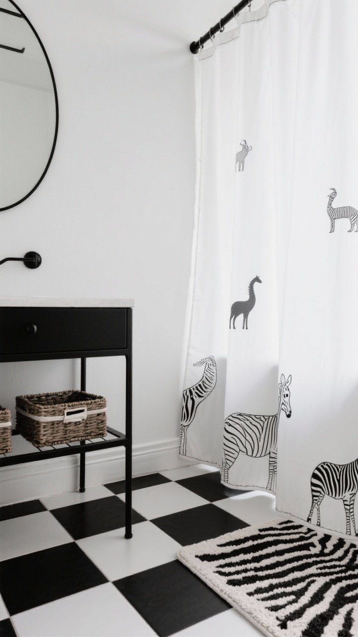 Pour une salle de bain super stylée et facile à faire évoluer, optez pour un duo noir & blanc. Un sol en carrelage damier, des murs blancs, et un rideau de douche avec silhouettes d’animaux dessinées en ligne fine.