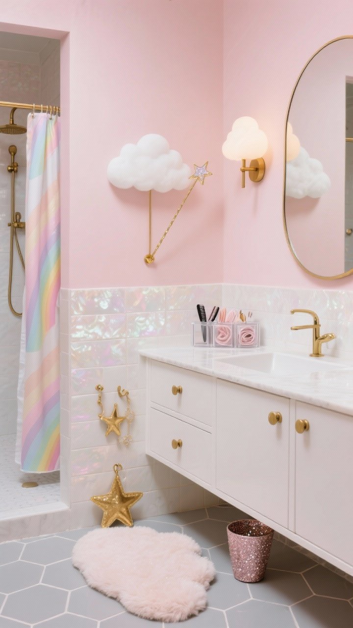 Le meuble vasque est blanc satiné avec poignées laiton. Ajoutez un miroir nuage, des boîtes transparentes pour barrettes et élastiques, et un rideau de douche avec un léger motif arc-en-ciel pastel.
