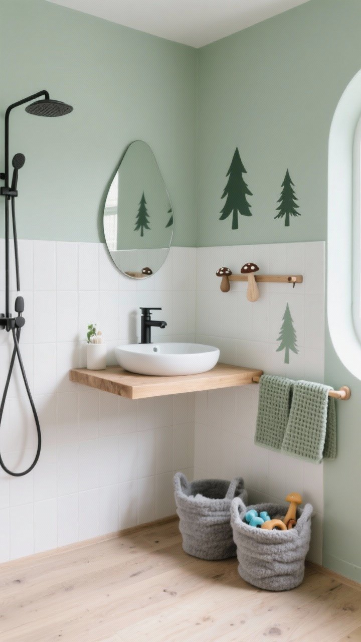 Côté mobilier, un meuble vasque en bois clair avec poignées rondes vert eucalyptus. Ajoutez un tabouret-banc pliant pour atteindre le lavabo et des serviettes rayées vert forêt. Un miroir rond avec cadre en bambou finalise l’ambiance.