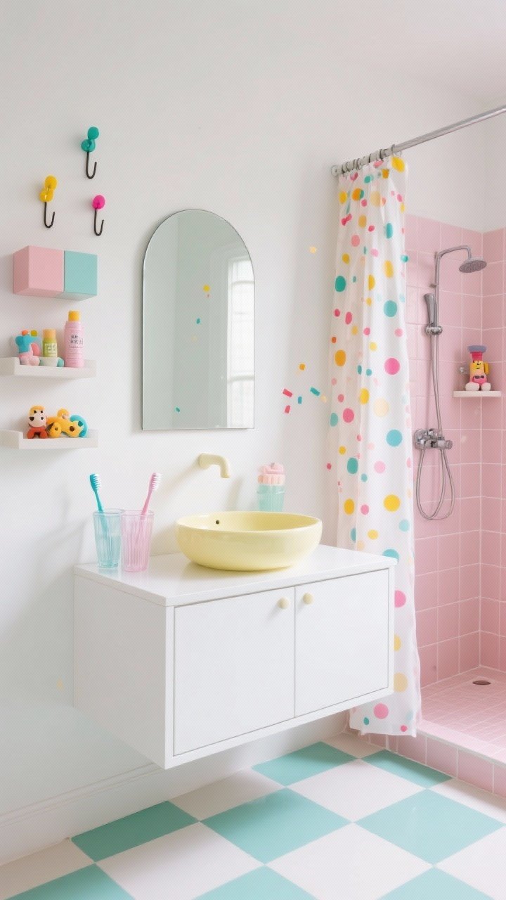 Ici, on imagine une base de carreaux zellige rose poudré pour la douche, et des murs blancs cassés pour la lumière. Le sol en vinyle effet damier menthe & crème donne le rythme, sans se prendre au sérieux.